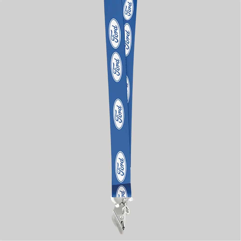 1″ Blue custom lanyard printed with company logo with Bulldog Clip attachment 1″