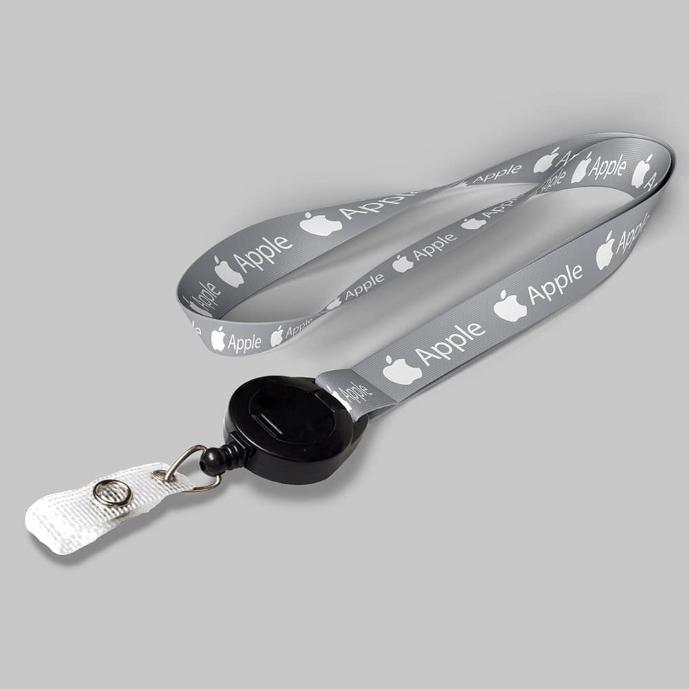 1″ Gray custom lanyard printed with company logo with Black Badge Reel attachment 1″