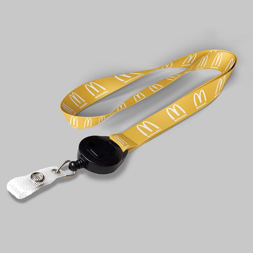 Our Yellow 1″ lanyard is a top selling promotional product. It comes standard with a Black Badge Reel. The attachment makes it easy to affix products onto the lanyard itself. This product features a 36″ standard length and 1″ width. Unlike other vendors, our lanyards come printed on both sides and we can PMS color match if needed. We also offer full color printing. Lanyards are great for trade shows, giveaways, employees, company picnics, business seminars or any type of business looking. 1″ L x 36″ W x 36″ H