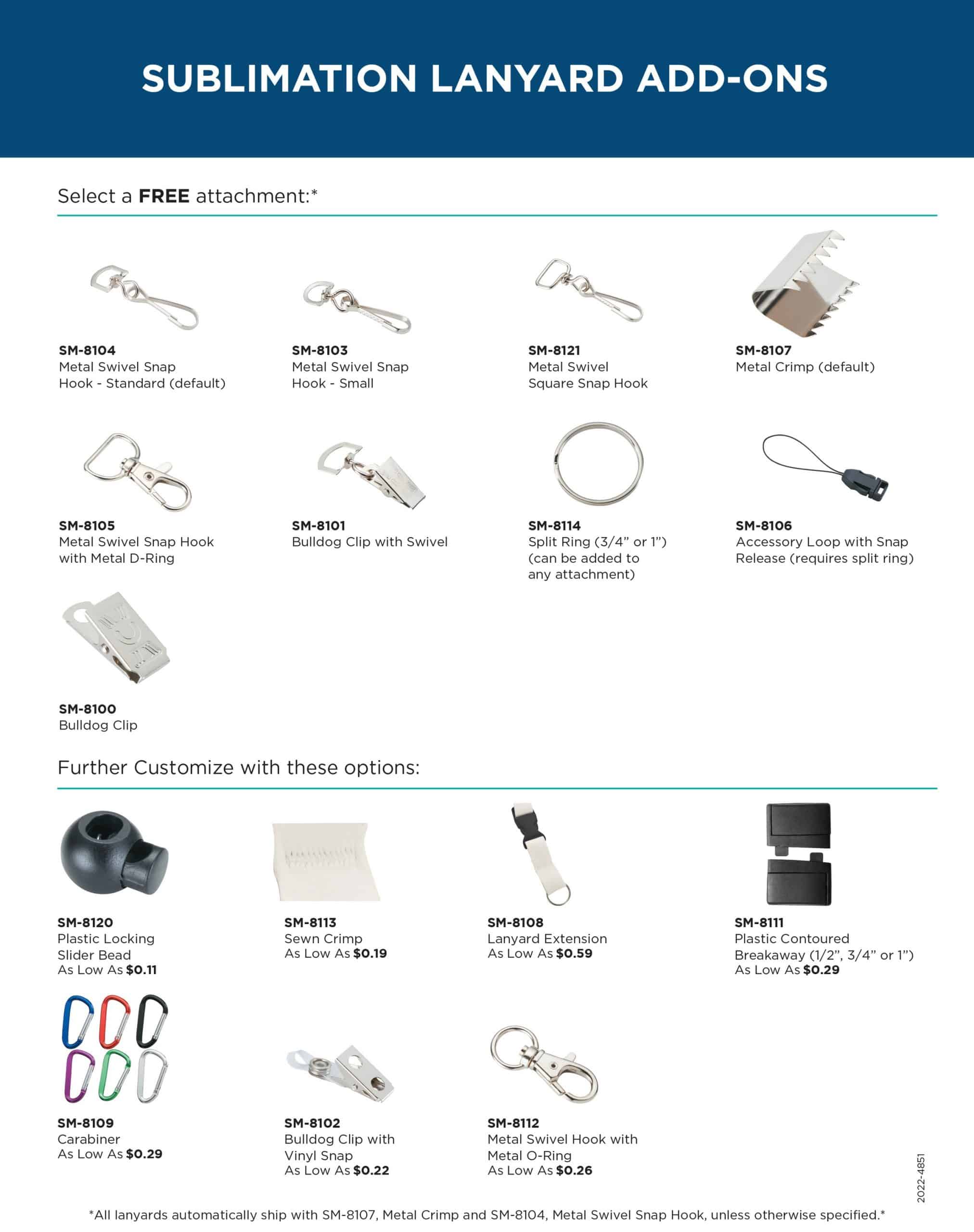The Full Color 3/4” Lanyard with Hook is a traditional, fully sublimation-dyed lanyard made in the United States using durable polyester materials. It features a textured finish and comes with two default attachments, including one metal crimp and one metal swivel snap hook (SM-8104). Alternate attachment options are available on request when placing your order. This colorful polyester lanyard measures 36” L x 3/4” W. 36.00″ D x 0.75″ W x 0.20″ H